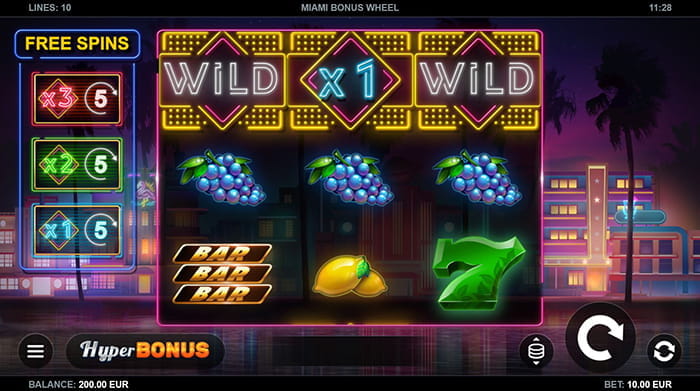 Beste Slots in einem Online Casino erkennt man ganz leicht an seinen Bonus Features. Die mit Fruchtsymbolen ausgestatteten Miami Bonus Wheel Slots bieten davon so einige: Das Rad Feature, den Hyper Bonus und das Freispiel Feature. Der Miami Bonus Wheel Slot ist mit seinem Aufbau ein absoluter Klassiker unter den Glücksspielautomaten, der auch die Möglichkeit bietet, das Gaming mobil abzurufen.