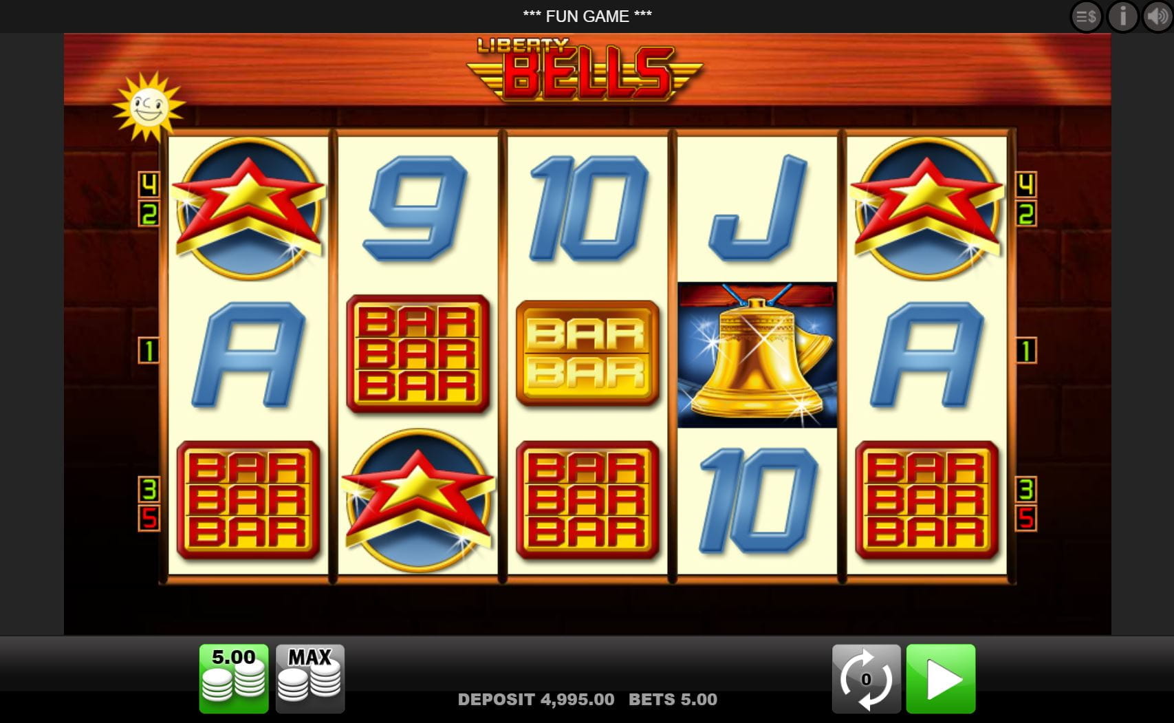 Die Menüs für die Liberty Bells Slot Machine hat Merkur simpel gehalten. Sowohl die Anzahl der Gewinnlinien (5) als auch die eingesetzten Münzen pro Linie stehen fest. Auswählen lässt sich nur der Gesamteinsatz in 8 Stufen zwischen 0,10 EUR und 10 EUR. Die fünf Walzen und drei Anzeiglinien bieten insgesamt 15 Symbolen einen Platz und der “Return to Player”-Wert liegt bei dieser Slotmaschine bei 95,99 %.