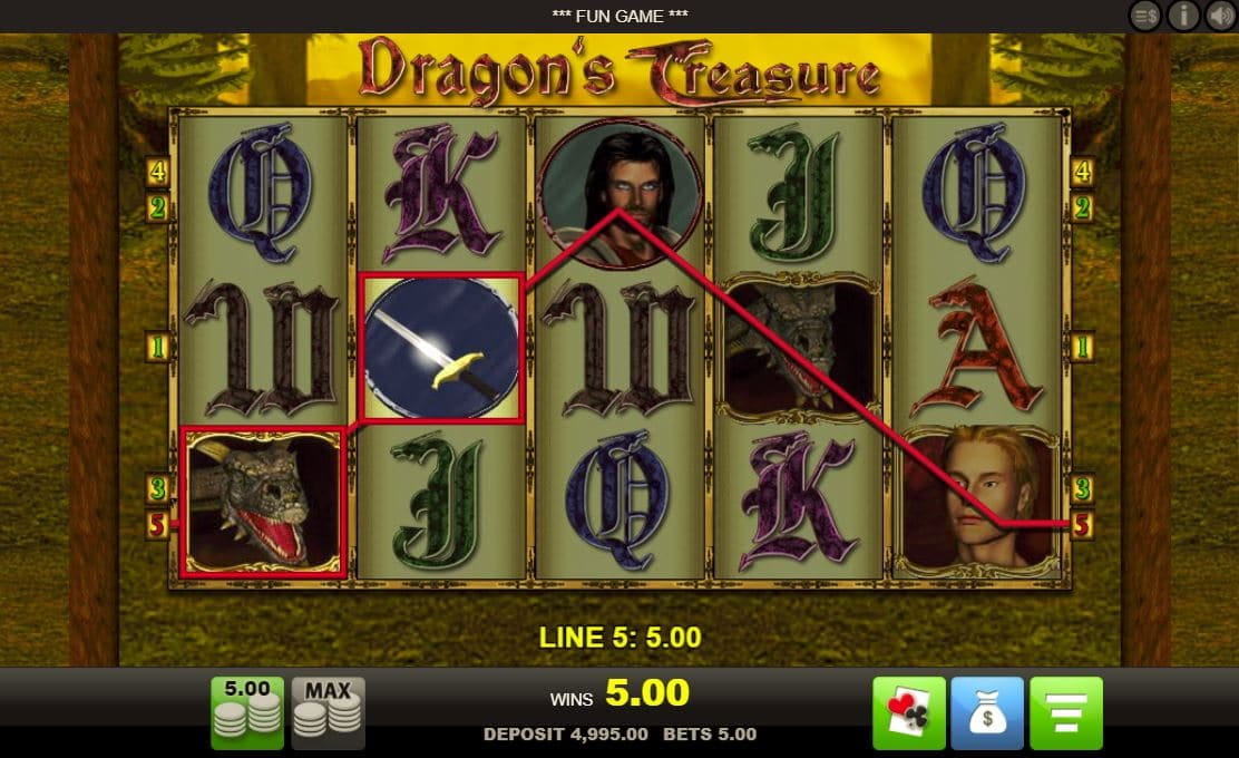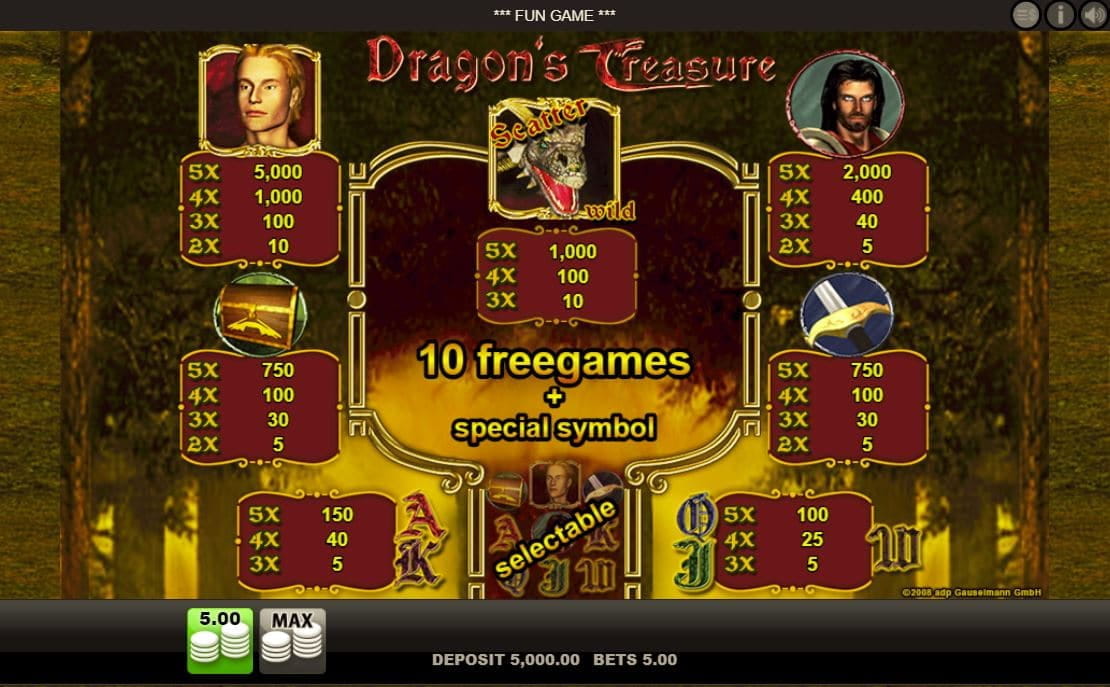 Fünf vertikale Walzen, drei Anzeigelinien und 10 nicht veränderbare Gewinnlinien hat die Dragons Treasure Slot Machine zu bieten. Bei fünf davon handelt es sich um die typischen Kartenwerte von der Zehn bis zum Ass, die in zwei unterschiedlichen Gewinnstufen angesiedelt sind. Hinzu kommen der Prinz sowie der tapfere Ritter Siegfried, das legendäre Schwert und natürlich der Drachenschatz, dargestellt in Form einer Truhe. Alle vier Symbole werden bereits ab zwei Gleichen auf einer Linie bezahlt. Der namensgebende Drache ist Scatter, Wild und Bonussymbol in Personalunion, kann überall auftauchen, fehlende Symbole ersetzen und erhöht den Gewinnmultiplikator. Ist er drei Mal vorhanden, gewinnt der Spieler 10 Freispiele, wobei vorher aus den verfügbaren neun Symbolen ein Spezialsymbol gewählt werden darf, das beim Auftauchen den Gewinn um den gewählten Einsatz erhöht.